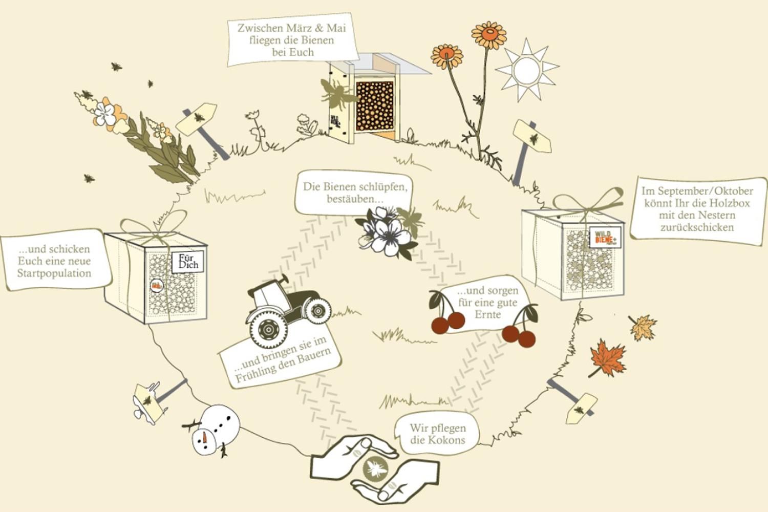 Das Zeitfenster für den Wildbienenflug liegt zwischen März und Juni. Sie können dann die faszinierenden und fleissigen Wildbienen bei der Bestäubung Ihrer Pflanzen und beim Bau der Nester in Ihrem Wildbienenhäuschen beobachten. Einmal geschlüpft, lebt die Mauerbiene 5–7 Wochen.
