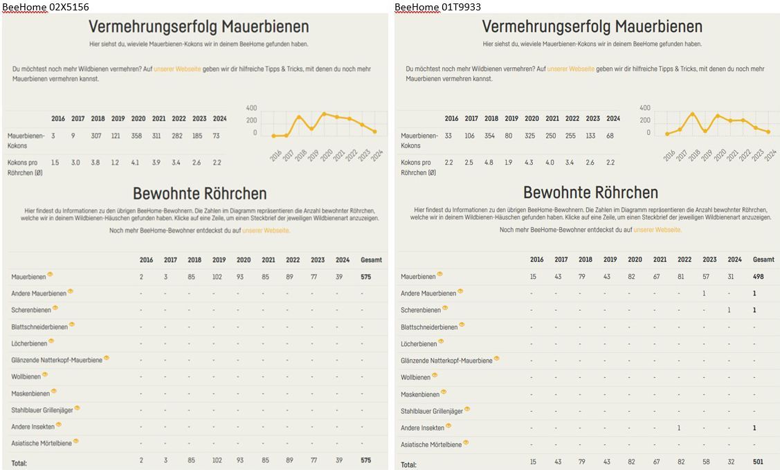 Je nach Standort und Jahr können rund 300–400 Wildbienen im Ihrem Häuschen heranwachsen. Der Durchschnitt lag in den letzten Jahren bei rund 120 Wildbienen. Wenn Sie uns das Häuschen zurückschicken, können Sie in unserer Bienenstatistik Ihren Zuchterfolg einsehen.